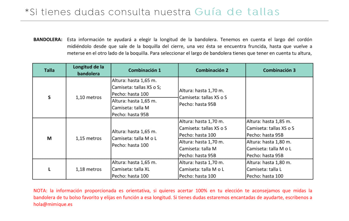 - Hay 3 tallas/longitudes distintas: S (longitud de bandolera de 1,10 cms), M (1,15 cms) y L (1,18 cms). La longitud del cordón se mide desde que sale de la boquilla del cierre, una vez ésta se encuentra fruncida, hasta que vuelve a meterse en el otro lado de la boquilla.
